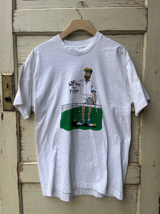Tennis player "will play for food" tee